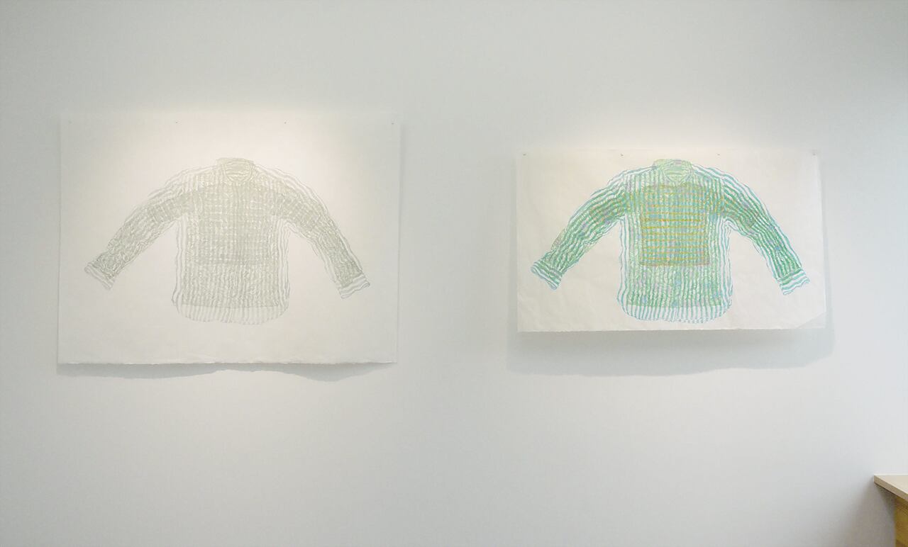 石川丘子の版画作品《Look into the distance》は「布」が隔てる境界を、木版に摺り取った作品です。