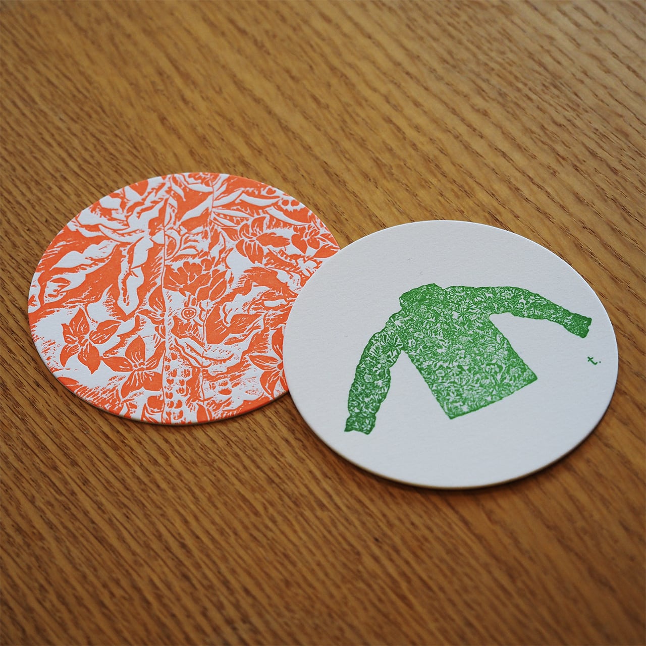 版画家、石川丘子の木版作品の図柄を活版印刷したオリジナルコースター。